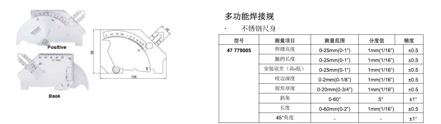 ·可用于测量:焊缝高度、腿的长度、安装误差(高-低)、咬边深度、圆角厚度、斜角、长度、45°角度