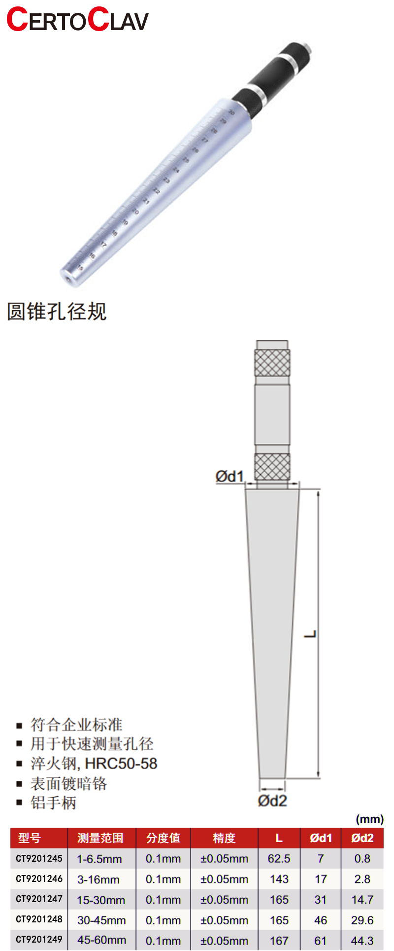 ·符合企业标准; ·用于快速测量孔径; ·淬火钢,HRC50-58; ·表面镀暗铬; ·铝手柄。