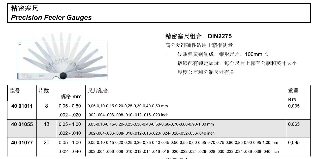 ·高公差准确性适用于精准测量 ·硬质弹簧钢制成, 锥形尺片, 1 00 m m 长 ·锁铢配有锁定螺母, 每个尺片上标有公制和英寸大小厚度公差和公制尺寸有关