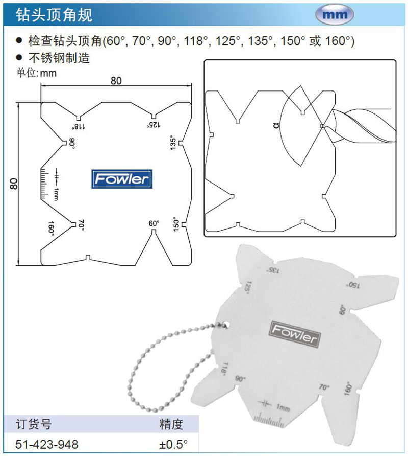 ·检查钻头顶角60°, 70°, 90°, 118°, 125°, 135°, 150° 或 160° ·不锈钢制造