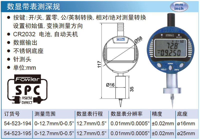 ·按键:开/关,置零,公/英制转换,相对/绝对测量转换 设置初始值,变换测量方向 ·CR2032 电池,自动关机 ·数据输出 ·不锈钢底座 ·针测头 ·单位:mm