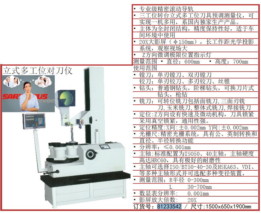 ·专业级精密滚动导轨三工位转台立式多工位刀具预调测量仪,可实现一机多用,系国内独家生产产品。 ·主体为全封闭结构,精度保持性好,适于车间环境中使用 ·20X大影屏(φ150mm),长工作距光学投影系统,观察视场大 ·Z方向微调极限位置指示灯 ·主轴:标准配置为ISO50、40主轴,主轴硬度高达HRC60,具有极好的耐磨性 ·主轴可选择ISO/BT50-40-30及HSKA63、VDI、等多种主轴形式并可选配多种变径装置,