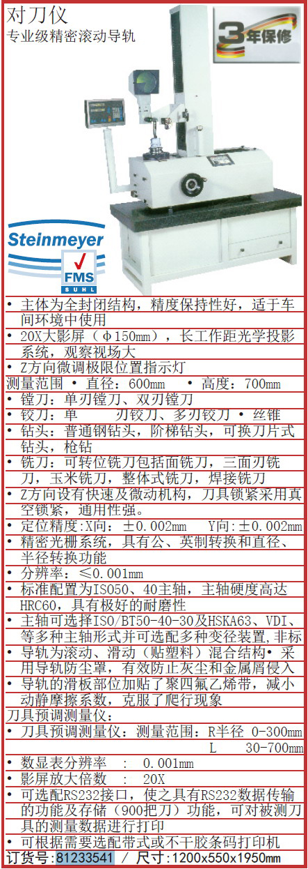 ·主体为全封闭结构,精度保持性好,适于车间环境中使用 ·20X大影屏(φ150mm),长工作距光学投影系统,观察视场大 ·Z方向微调极限位置指示灯 ·Z方向设有快速及微动机构,刀具锁紧采用真空锁紧,通用性强。 ·可选配RS232接口,使之具有RS232数据传输的功能及存储(900把刀)功能,可对被测刀具的测量数据进行打印 ·可根据需要选配带式或不干胶条码打印机 ·精密光栅系统,具有公、英制转换和直径、半径转换功能 ·标准配置为ISO50、40主轴,主轴硬度高达HRC60,具有极好的耐磨性 ·主轴可选择IS
