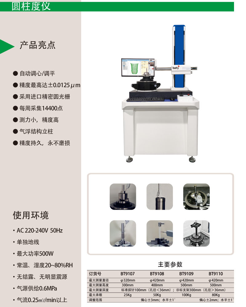 自动调心/调平 精度最高达士0.0125um 采用进口精密圆光栅 每周采集14400点 测力小,精度高 气浮结构立柱 精度持久,永不磨损
