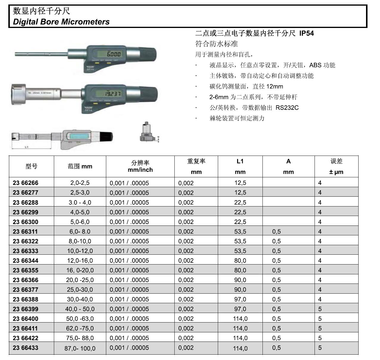 订货号 制造商型号 测量范围 分度值 精度 分辨率 重复率 L1 A 误差 价格 购物车