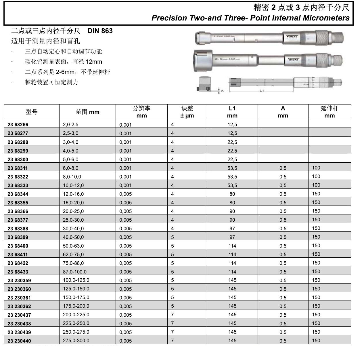 ·二点或三点内径于分尺 DIN 863适用于测量内径和盲孔 三点自动定心和自动调节功能碳化鸽测晕表面. ·直径 12mm 二点系列是 2-6mm. 不带延伸杆棘轮装置可恒定测力