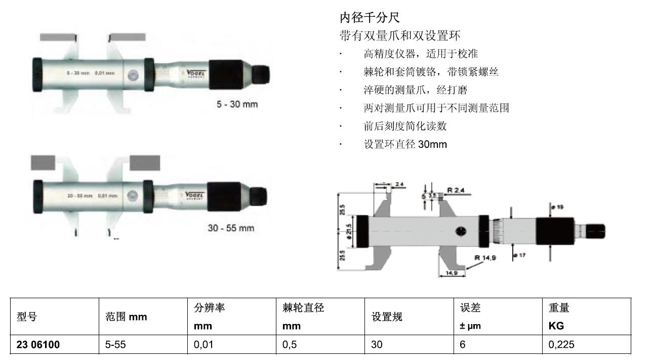 ·高精度仪器. 适用千校准 ·棘轮和套简锁铭. 带锁紧螺丝 悴硬的测晕爪. 经打磨 ·两对测量爪可用于不同测量范围 前后刻度简化读数 ·设置环直径30mm