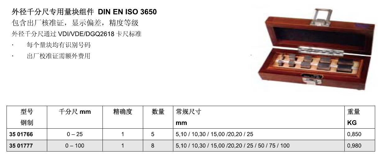 ·外径千分尺专用量块组件DINEN ISO 3650 包含出厂核准证.显示偏差.精度等级