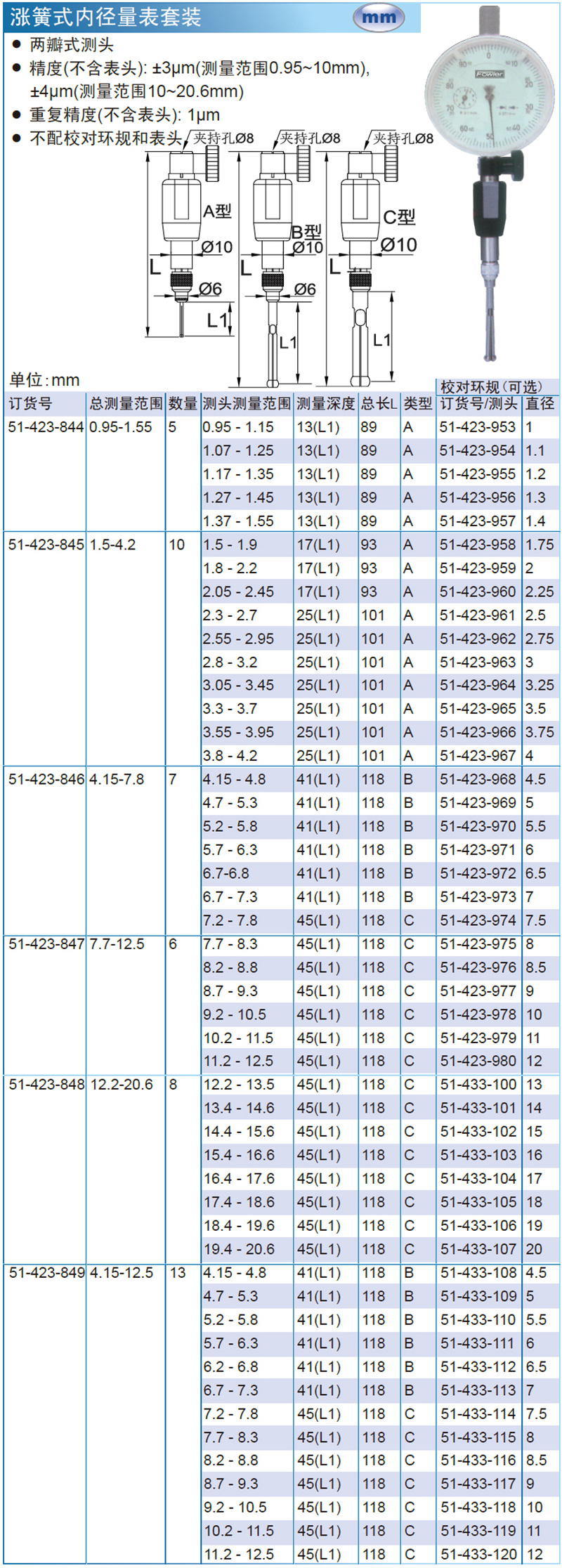 ·两瓣式测头 ·精度(不含表头): ±3μm(测量范围0.95~10mm), ±4μm(测量范围10~20.6mm) ·重复精度(不含表头): 1μm ·不配校对环规和表头