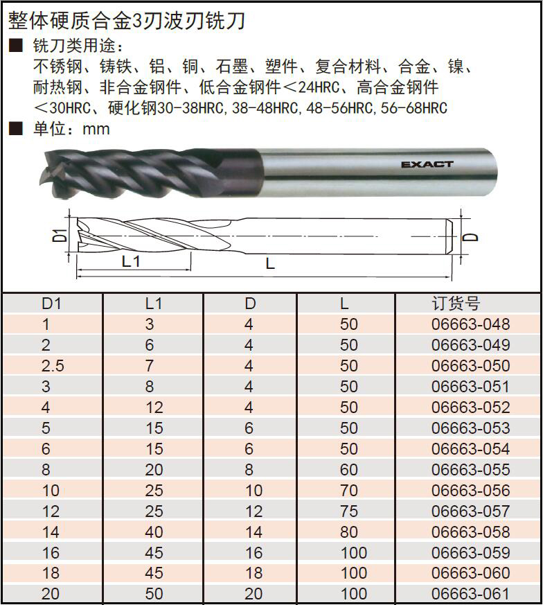 订货号 制造商型号 刃径 有效刃长 总长度 柄径 刃数 适宜加工材料 材质编码 倒角(C/R) 柄部夹持方式 价格 购物车
