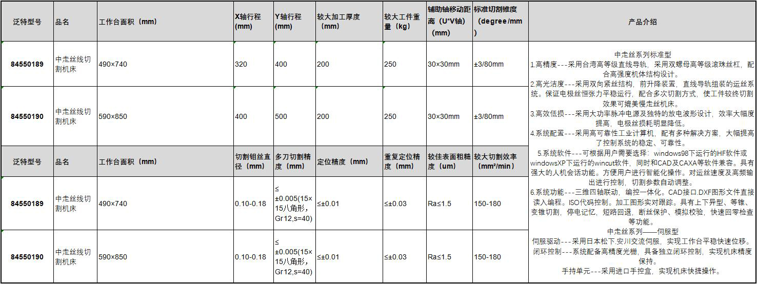 订货号 制造商型号 砂轮片规格 主轴空载转速 主电动机功率 毛重/净重 包装尺寸 工作台面积 X轴行程 Y轴行程 较大加工厚度 较大工件重量 辅助轴移动距离U*V轴 标准切割锥度degree 切割钼丝直径 多刀切割精度 定位精度 重复定位精度 较佳表面粗糙度 较大切割效率 价格 购物车