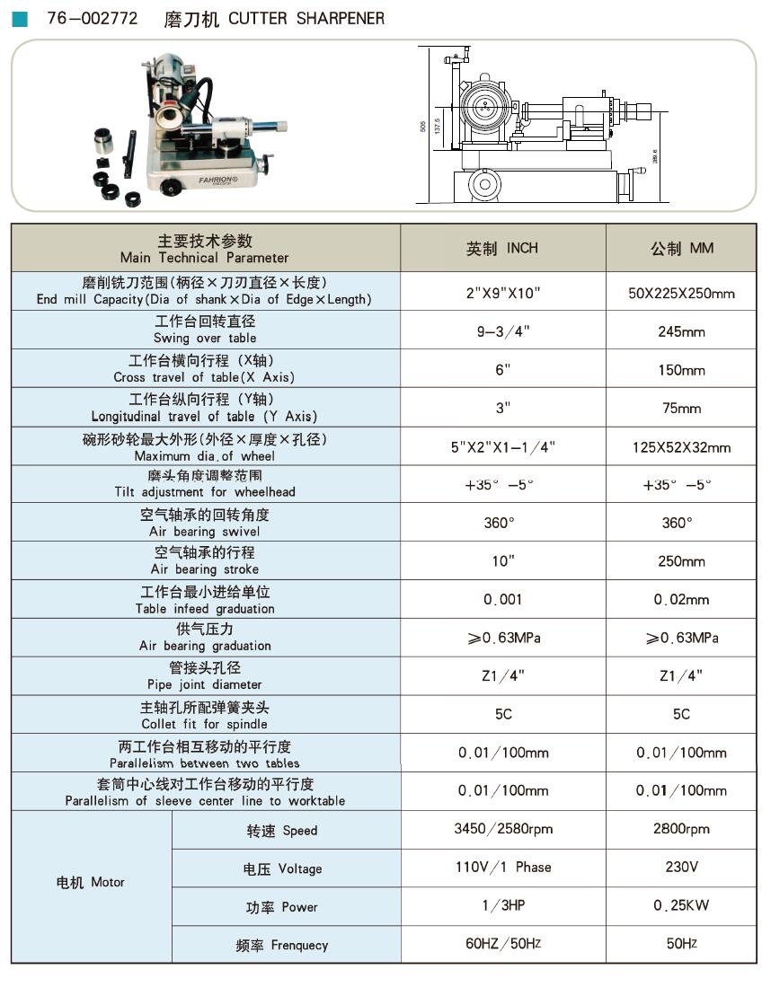 订货号 制造商型号 中心高 最大修整砂轮直径 精度 备注1 磨削铣刀范围(柄径×刀刃直径×长度)End mill Capacity (Dia of shank×Dia of Edge×Length) 工作台回转直径Swing over table 工作台横向行程〔x轴)Cross travel of table(×Axis) 工作台纵向行程〔Y轴)Longitudinal travel of table (Y Axis) 碗形砂轮最大外形(外径×厚度×孔径)Maximum dia .of wheel 磨头角度调整范围Tilt adjustment for wheelhead 空气轴承的回转角度Air bearing swivel 空气轴承的行程Air bearing stroke 工作台最小进给单位Table infeed graduation 供气压力Air bearing graduation 管接头孔径Pipe joint diameter 主轴孔所配弹簧夹头Collet fit for spindle 两工作台相互移动的平行度arallelism between two tables 套筒中心线对工作台移动的平行度Parallelism of sleeve center line to worktable 电机 转速 电机 电压 价格 购物车