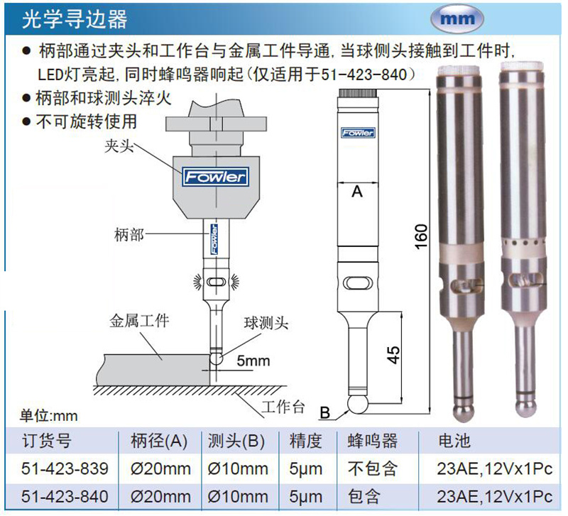 ·柄部通过夹头和工作台与金属工件导通,当球侧头接触到工件时,LED灯亮起,同时蜂鸣器响起仅适用于51-423-840 ·柄部和球测头淬火 ·不可旋转使用