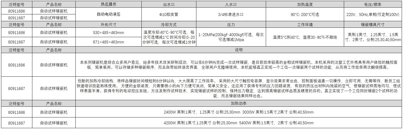 ·说明:创新的加热冷却结构,将样品镶嵌时间缩短到6分钟以内,大大提高了工作效率。 采用的大尺寸触控电容屏,显示效果非常出色,控制面板涵盖一切操作,立即可用,无需等待,新员工经快速培训技能熟练使用。 方便的金锁装置,只需要很小的向下力便可关闭,简单又安全。还应用了获得专利的压力回路装置,有效的挤压出材料内残留的空气,使镶嵌试样质地均匀,使试样表面平滑。获得专利的电动控压系统、方法及制作试样技术,实现镶嵌试样的控制、保持压力稳定,达到提高镶嵌试样品质及硬度的目的。真正实现了一个工