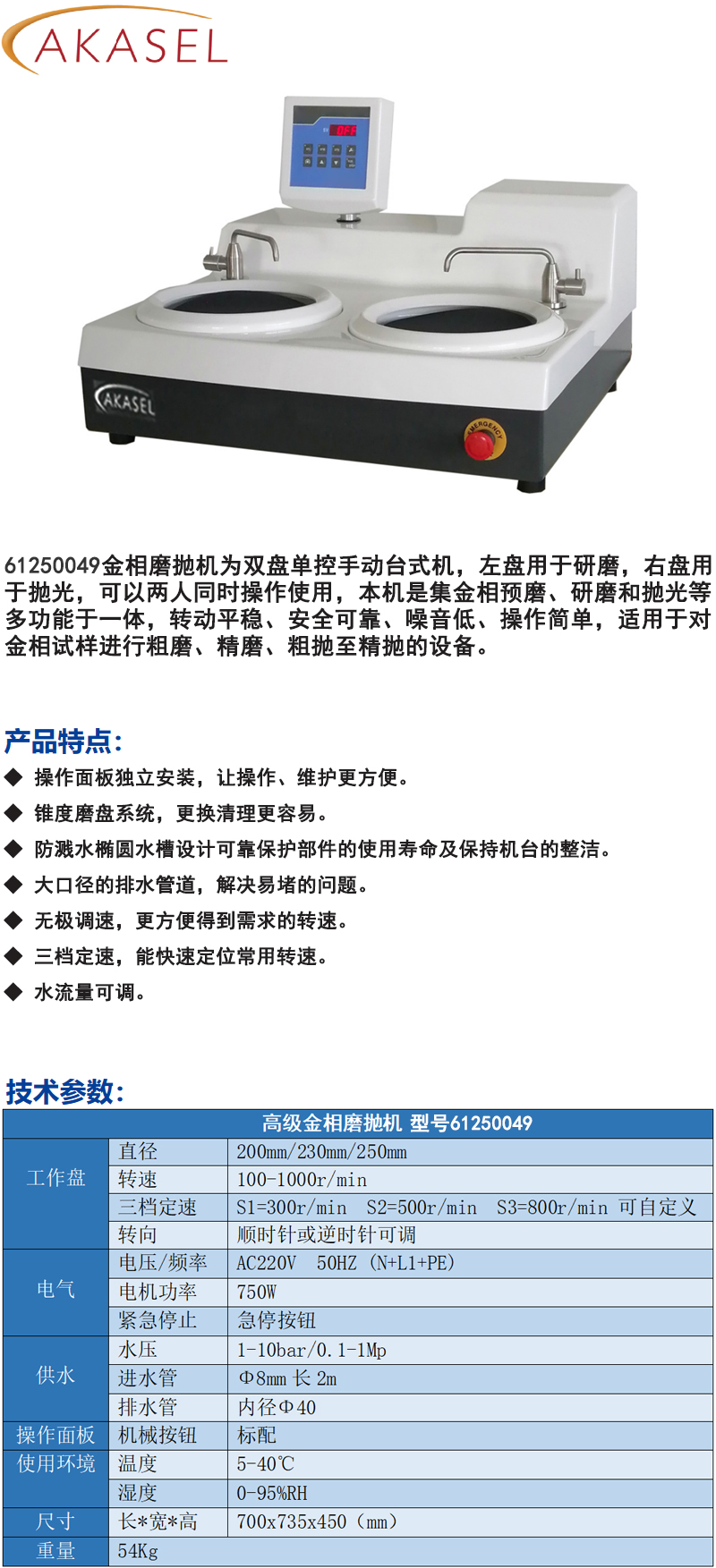 C25446 61250049 100~1000r/min AC220V 50HZ 750W 700x735x450mm 54Kg φ200mm/φ230mm/φ250mm S1=300r/min S2=500r/min S3=800r/min 可自定义 顺时针或逆时针可调 急停按钮 1~10bar/0.1~1Mp Φ8mm长2m 内径Φ40 标配 5~40℃ 0~95%RH 29400.00