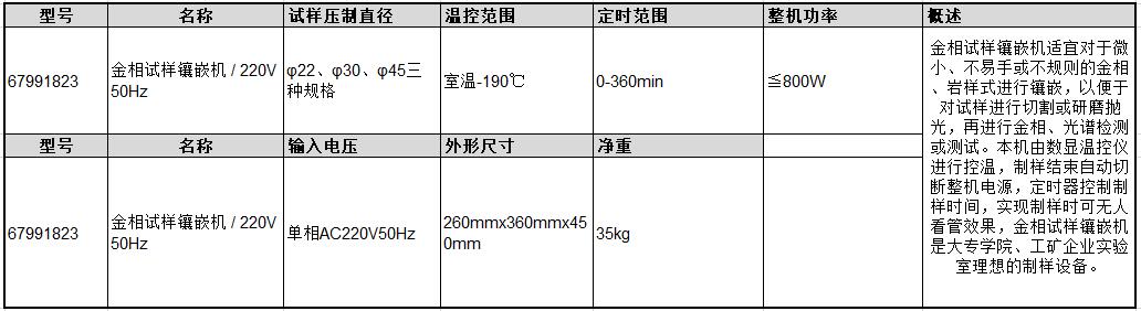 订货号 制造商型号 试样直径 温度范围 保压/保温时间 电源 功率 尺寸 重量 定时范围 价格 购物车