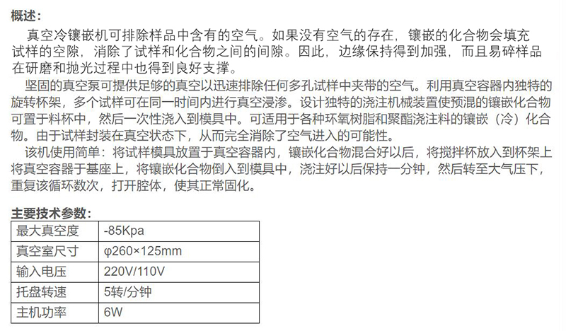 ·真空冷镶嵌机可排除样品中含有的空气。如果没有空气的存在,镶嵌的化合物会填充试样的空隙,消除了试样和化合物之间的间隙。因此,边缘保持得到加强,而且易碎样品在研磨和抛光过程中也得到良好支撑。 ·坚固的真空泵可提供足够的真空以迅速排除任何多孔试样中夹带的空气。利用真空容器内独特的旋转杯架,多个试样可在同一时间内进行真空浸渗。设计独特的浇注机械装置使预混的镶嵌化合物可置于料杯中,然后一次性浇入到模具中。可适用于各种环氧树脂和聚酯浇注料的镶嵌(冷)化合物。由于试样封装在真空状态下,从而完全消除了空气进入的可能性。 ·该机使用简单:将试样模具放置于真空容器内,镶嵌化合物混合好以后,将搅拌杯放入到杯架上将真空容器于基座上,将镶嵌化合物倒入到模具中,浇注好以后保持一分钟,然后转至大气压下,重复该循环数次,打开腔体,使其正常固化。