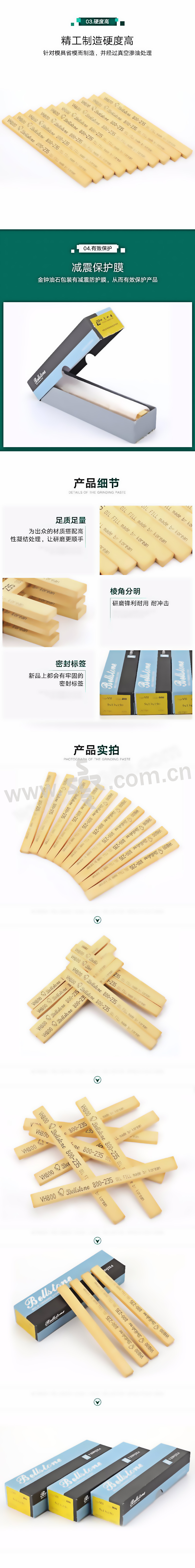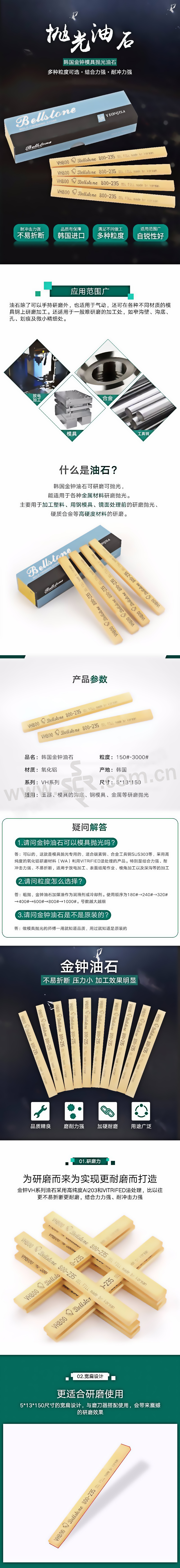 ·为研磨而来为实现更耐磨而打造,金钟VH系列油石采用高纯度AI203和VITRIFED法处理,比以往更不易折断更耐磨,结合力强,耐冲击力强·5×13×150尺寸的宽扁设计,与磨刀器搭配使用,会带来震撼的研磨效果·针对模具省模而制造,并经过真空渗油处理·金钟油石包装有减震防护膜,从而有效保护产品