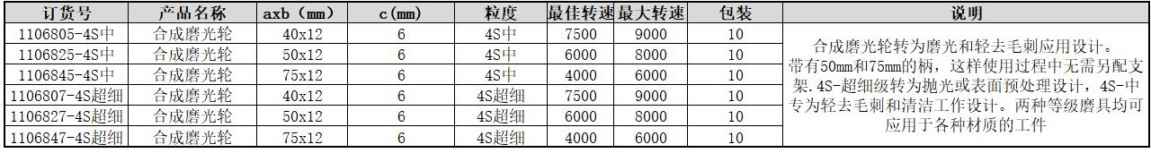 ·合成磨光轮转为磨光和轻去毛刺应用设计。 带有50mm和75mm的柄,这样使用过程中无需另配支架.4S-超细级转为抛光或表面预处理设计,4S-中专为轻去毛刺和清洁工作设计。两种等级磨具均可应用于各种材质的工件
