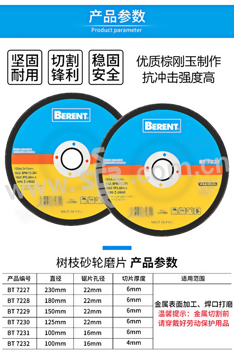 BERENT/百锐 树脂砂轮磨片 BT7228 180×6×22mm 1片