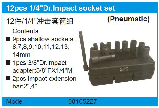 9个浅冲击套筒: 6,7,8,9,10,11,12,13, 14毫米 1pcs 3/8“ 适配器:3/8“ FX1 / 4” M 2个冲击扩展 栏:2“,4”