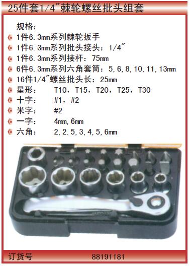 ·规格: ·1件6.3mm系列棘轮扳手 ·1件6.3mm系列批头接头:1/4" ·1件6.3mm系列接杆:75mm ·6件6.3mm系列六角套筒:5,6,8,10,11,13mm ·16件1/4"螺丝批头长:25mm ·星形: T10,T15,T20,T25,T30 ·十字: #1,#2 ·米字: #2 ·一字: 4mm,6mm ·六角: 2,2.5,3,4,5,6mm