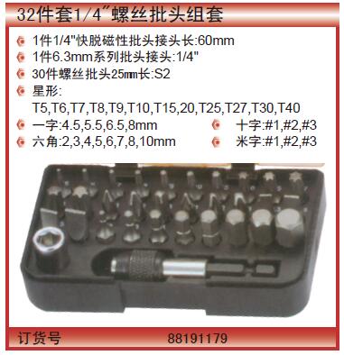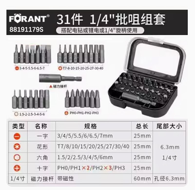 ·1件1/4"快脱磁性批头接头长:60mm ·1件6.3mm系列批头接头:1/4" ·30件螺丝批头25mm长:S2 ·星形: T5,T6,T7,T8,T9,T10,T15,20,T25,T27,T30,T40 ·一字:4.5,5.5,6.5,8mm 十字:#1,#2,#3 ·六角:2,3,4,5,6,7,8,10mm 米字:#1,#2,#3 使用 88191179S 替代 FORANT_31件套螺丝批头组套 88191179S 31件套螺丝批头组套