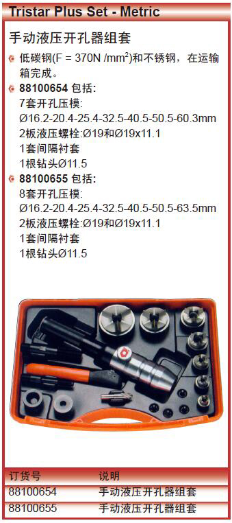 ·手动液压开孔器组套低碳钢(F=370N/mm2)和不锈钢,在运输箱完成。