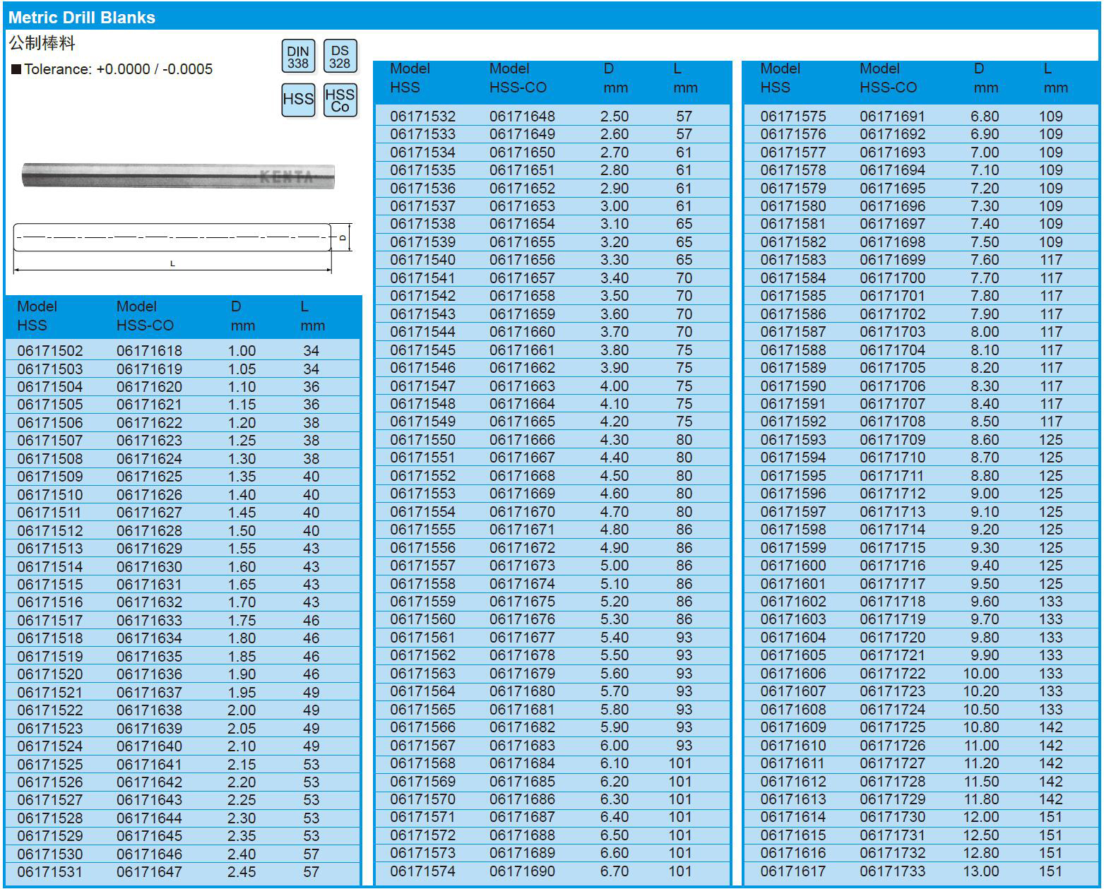高速钢公制棒料 06171513 D1.55×43mm 1支