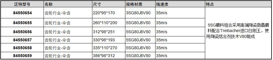 ·5SG磨料组合采用高端陶瓷微晶磨料配合Treibacher进口白刚玉,使用最先进陶瓷结合剂技术V80制成之伞齿砂轮可达到国际最先进水平。