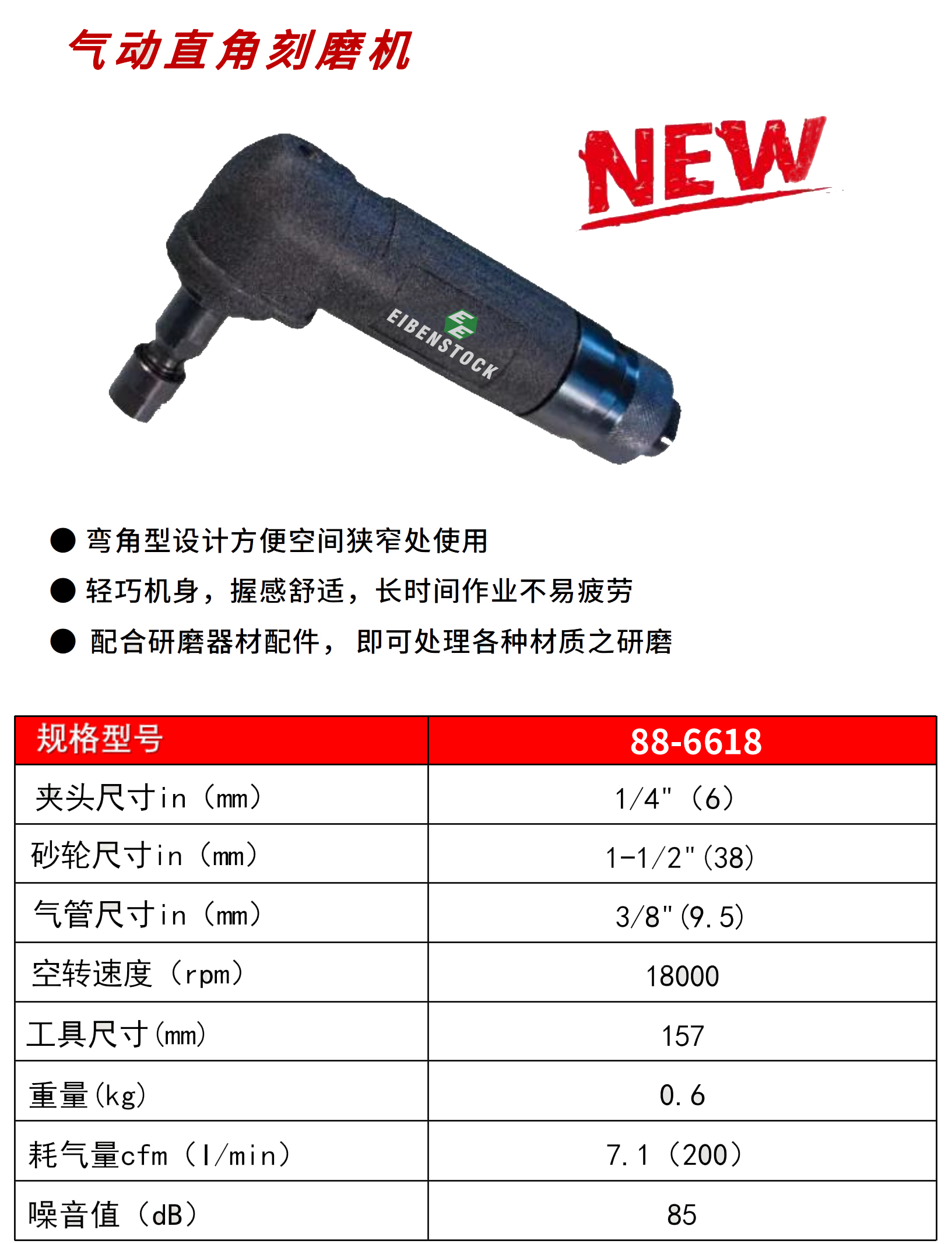 弯角型设计方便空间狭窄处使用 轻巧机身,握感舒适,长时间作业不易疲劳 配合研磨器材配件,即可处理各种材质之研磨