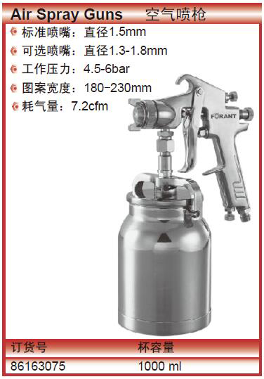 订货号 制造商型号 标准喷嘴 涂料供给方式 喷涂距离 喷涂空气压力 空气使用量 涂料喷出量 喷幅 漆杯容量 建议所用压缩机 净重 是否有喷壶 可选喷嘴 图案宽度 价格 购物车