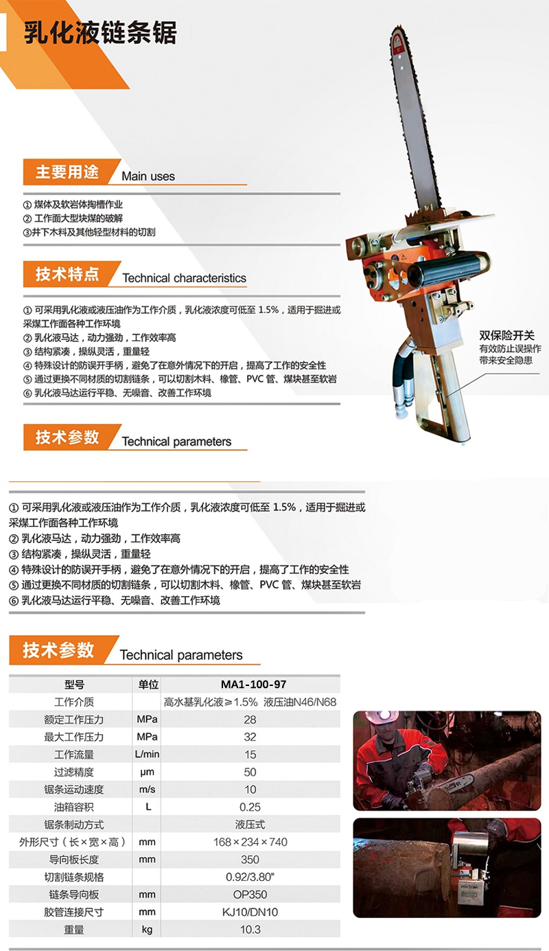 ·可采用乳化液或液压油作为工作介质,乳化液浓度可低至1.5%,适用于掘进或采煤工作面各种工作环境 ·乳化液马达,动力强劲,工作效率高 ·结构紧凑,操纵灵活,重量轻 ·特殊设计的防误开手柄,避免了在意外情况下的开启,提高了工作的安全性 ·通过更换不同材质的切割链条,可以切割木料、橡管、PVC管、煤块甚至软岩 ·乳化液马达运行平稳、无噪音、改善工作环境