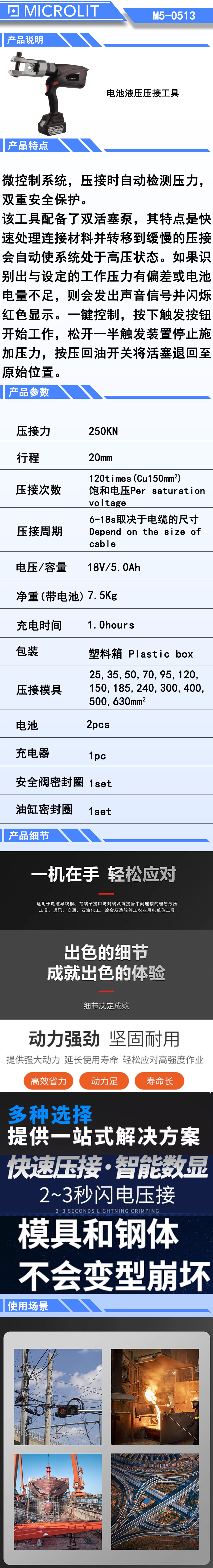 * 微控制系统,压接时自动检测压力,双重安全保护。 * 该工具配备了双活塞泵,其特点是快速处理连接材料并转移到缓慢的压接会自动使系统处于高压状态。 * 如果识别出与设定的工作压力有偏差或电池电量不足,则会发出声音信号并闪烁红色显示。 * 一键控制,按下触发按钮开始工作,松开一半触发装置停止施加压力,按压回油开关将活塞退回至原始位置。 * 温度传感器使工具自动停止工作,当长时间工作温度超过60℃时,故障信号响起,这意味着工具必须等到温度降至正常水平才能继续工作。 * 一键控制连续使用功能一一功能1:按下触发器开始工作,松开触发器意味着停止加压,继续增加压力,直到跳压活塞返回初始位置。功能2:按下触发器开始工作,松开触发器意味着停止加压,继续加大压力跳压活塞回位,按下引发活塞回到停止,继续按下开关机进入新的加压工作。功能3:按下扳机开始工作,松开扳机表示停止加压,继续加压压力上升后跳按扳机后停止后退,继续按压扳机后跳不放扳机活塞自动停止后回到最后一个停止位,可选择任意大小位置两次在未放扳机自动停止位置选择。