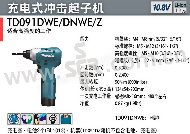 MAKITA/牧田 锂电充电式冲击起子机M柄 TD091DWE 包含两电一充 10.8V/1.3Ah 1台