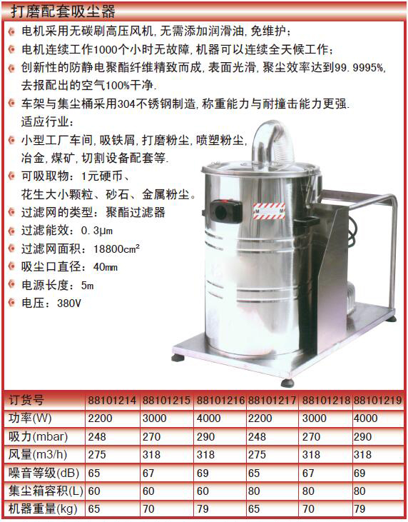 ·电机采用无碳刷高压风机,无需添加润滑油,免维护; ·电机连续工作1000个小时无故障,机器可以连续全天候工作; ·创新性的防静电聚酯纤维精致而成,表面光滑,聚尘效率达到99.9995%,去报配出的空气100%干净。 ·车架与集尘桶采用304不锈钢制造,称重能力与耐撞击能力更强。
