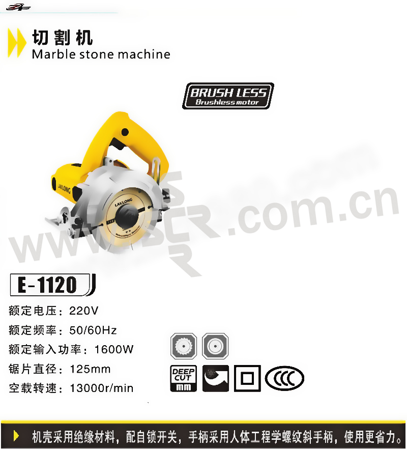 ·机壳采用绝缘材料,配自锁开关,手柄采用人体工程学螺纹斜手柄,使用更省力。