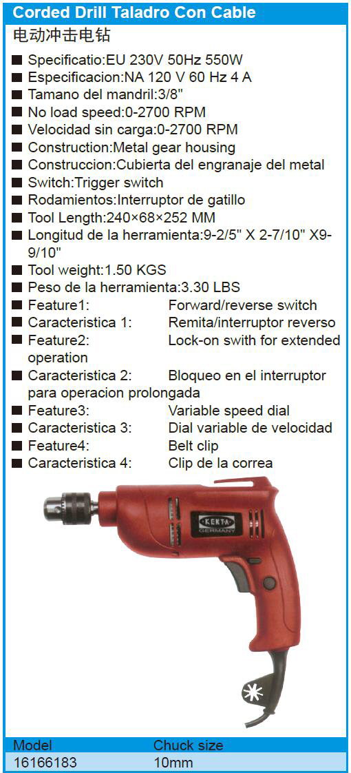 英文名称:  Corded Drill Taladro Con Cable