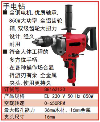 ·全铜电机,优质轴承,850W大功率,全铝齿轮箱,双级齿轮大扭力设计,经久耐用 ·符合人体工程的多方位手柄,在各种操作场合显得游刃有余,全金属夹头,使用更持久