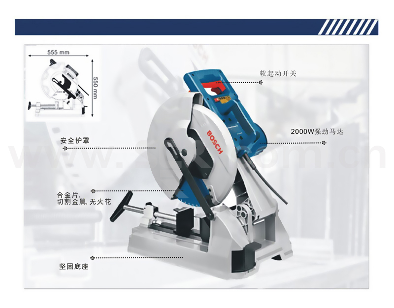 ·2000 瓦高扭矩马达能够实现快速的作业进程。 ·机器配备带启动电流限制的软启动功能。 ·集成式侧面加长件可为长工件提供理想支撑。 ·无需工具便可调节角度,以确保轻松操控和斜榫切割。 ·坚固的强化铸铝支承工作台。 ·易读的度数刻度使从 90 度至 45 度的调节变得更简单。 ·配备“Expert for Steel”钢材切割专业型锯条,可实现长使用寿命和清洁切割。