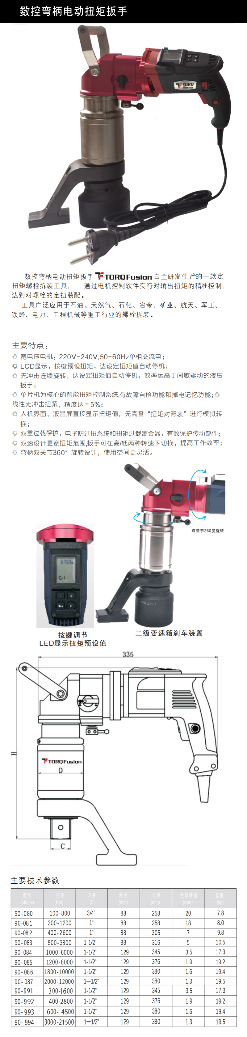 ? 宽电压电机: 220V-240V,50-60Hz单相交流电;?LCD显示, 按键预设扭矩, 达设定扭矩值自动停机;? 无冲击连续旋转, 达设定扭矩值自动停机, 效率远高于间歇驱动的液压扳手;? 单片机为核心的智能扭矩控制系统,有故障自检功能和掉电记忆功能; ?线性无冲击扭紧, 精度达土5%;?人机界面 , 液晶屏直接显示扭矩值, 无需查 " 扭矩对照表” 进行模拟转换;? 双重过载保护 , 电子防过扭系统和扭矩过载离合器 , 有效保护传动部件;? 双速设计更宽扭矩范围,扳手可在高/低两种转速下切换, 提高工作效率;? 弯柄双关节360° 旋转设计 , 使用空间更灵活。