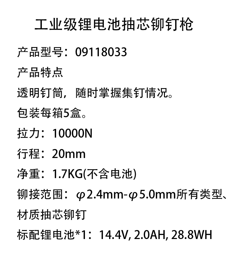 工业级锂电池抽芯铆钉抢 09118033 20mm