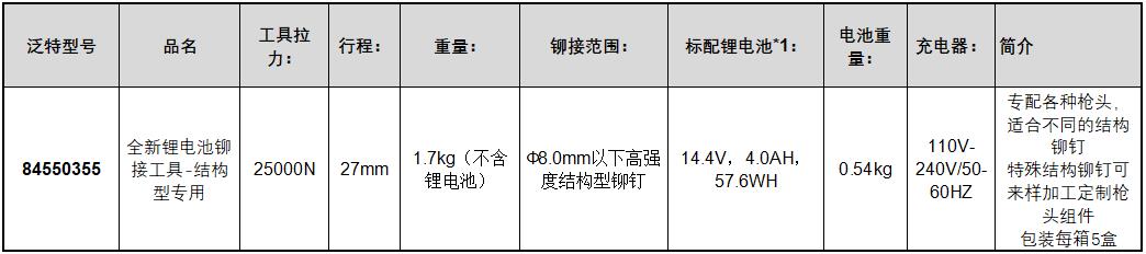 A32441 84550355 25000N 27mm 1.7kg不含锂电池 Φ8.0mm以下高强度结构型铆钉 14.4V,4.0AH,57.6WH 0.54kg 110V-240V/50-60HZ 9874.81