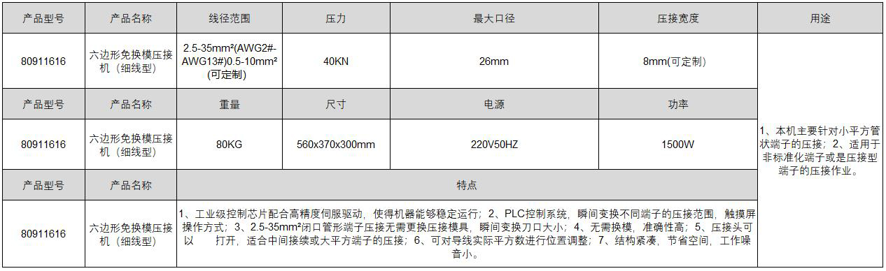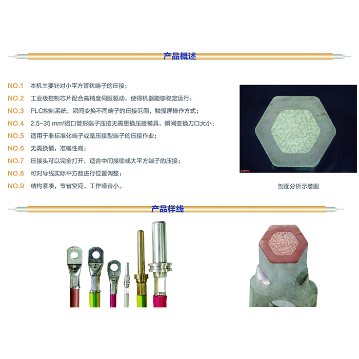 ·工业级控制芯片配合高精度伺服驱动,使得机器能够稳定运行; ·PLC控制系统,瞬间变换不同端子的压接范围,触摸屏操作方式; ·2·5-35mm²闭口管形端子压接无需更换压接模具,瞬间变换刀口大小; ·无需换模,准确性高;压接头可以完全打开,适合中间接续或大平方端子的压接; ·可对导线实际平方数进行位置调整; ·结构紧凑,节省空间,工作噪音小。 ·用途:1、本机主要针对小平方管状端子的压接;2、适用于非标准化端子或是压接型端子的压接作业。