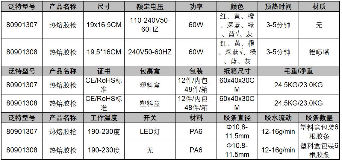 A32371 80901307 110-240V50-60HZ 60W Φ10.8-11.5mm 3-5分钟 12-16g/min 19×16.5CM 红、黄、橙、深蓝、绿、蓝√、灰 塑料盒 12件/内包,48件/箱 60×40×30CM 24.5KG/23.0KG 190-230度 LED灯 PA6 塑料盒包装6根胶条 222.75