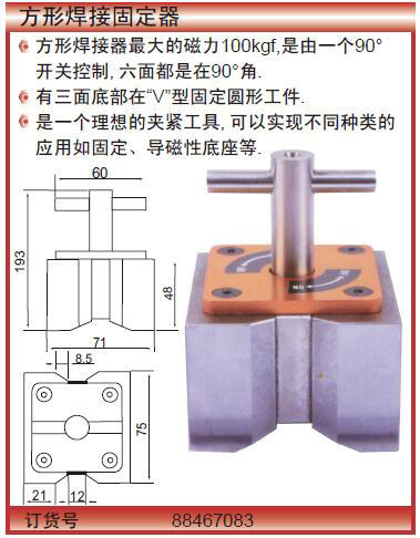 ·方形焊接器最大的磁力100kgf,是由一个90°开关控制,六面都是在90°角.有三面底部在“V”型固定圆形工件.是一个理想的夹紧工具,可以实现不同种类的应用如固定、导磁性底座等.