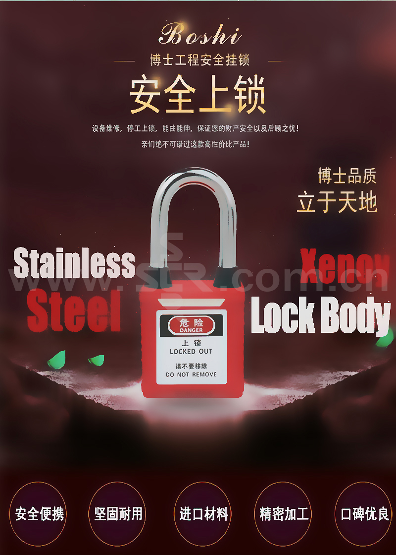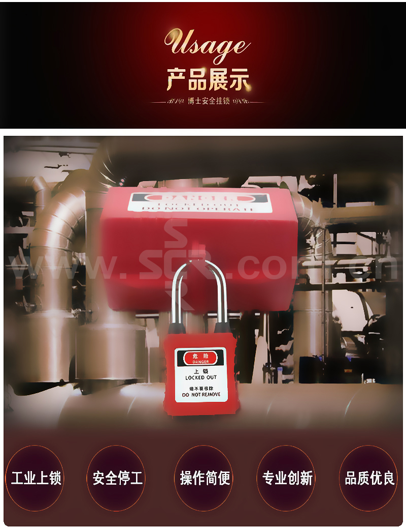 ·配安全警示标语及可重复擦写安全标签,语言中英文·锁体由工程塑料尼龙PA制成,防紫外线,耐腐蚀,一体式设计,耐用,抗温差(-57℃~+177℃),抗冲击·留匙性:打开状态钥匙不能被拔出,确保挂锁不被遗留·底部和锁梁两侧皆有绝缘胶套