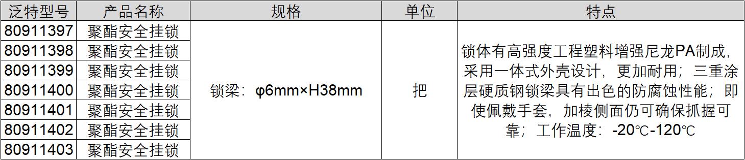 ·锁体有高强度工程塑料增强尼龙PA制成,采用一体式外壳设计,更加耐用; ·三重涂层硬质钢锁梁具有出色的防腐蚀性能; ·即使佩戴手套,加棱侧面仍可确保抓握可靠;工作温度:-20℃-120℃