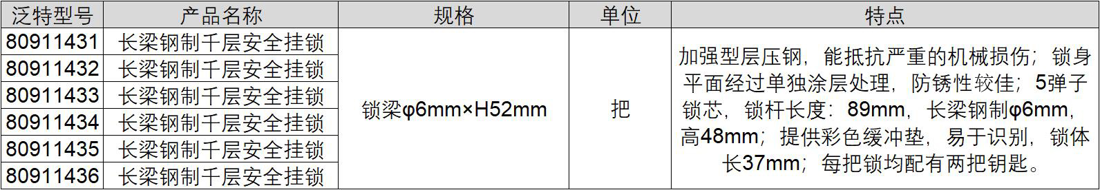 ·加强型层压钢,能抵抗严重的机械损伤; ·锁身平面经过单独涂层处理,防锈性极佳;5弹子锁芯,锁杆长度:89mm,长梁钢制φ6mm,高48mm; ·提供彩色缓冲垫,易于识别,锁体长37mm; ·每把锁均配有两把钥匙。