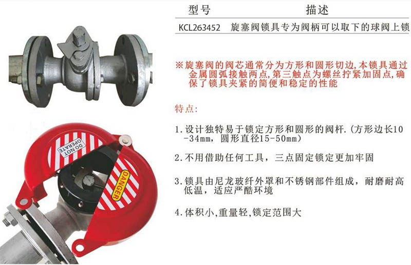 ·旋塞阀的阀芯通常分为方形和圆形切边,本锁具通过金属圆弧接触两点,第三触点为螺丝拧紧加固点,确保了锁具夹紧的简便和稳定的性能